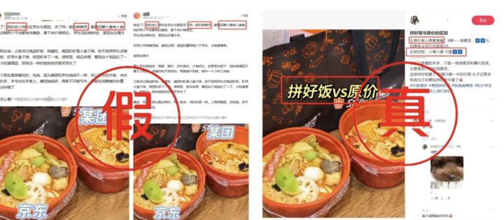 最后,“不同平台分量缩水”也为恶意造谣。社交平台上出现多个账号发布在不同平台点同一家外卖对比的内容,语言、逻辑、造谣内容相似,最终指向美团抽佣高致商家减量降质。美团声明,相关内容与事实严重不符,“对比图片”早在今年1月就批量出现,且已溯源到系MCN账号恶意发布博流量。