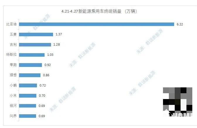 4月21日-4月27日,乘用车总量45.2万辆,环比增长16.73%,新能源23.8万辆,环比增长16.03%,新能源渗透率52.58%。比亚迪以6.22万辆的成绩位列榜首,展现出强大的市场统治力。