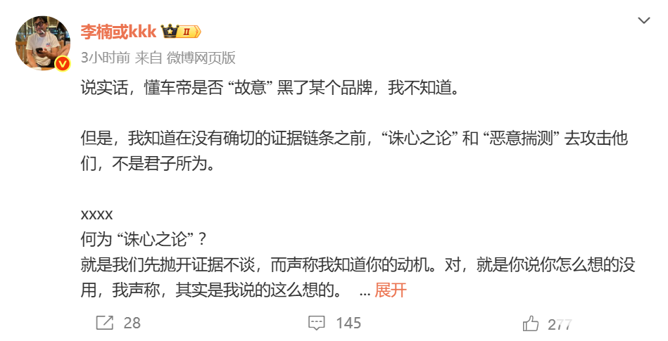 7月26日,近日魅族前高管李楠近日也在社交媒体针对懂车帝多次发文,今日他再次发文并表示,在没有确切的证据链条之前,“诛心之论”和“恶意揣测”去攻击他们,不是君子所为。
