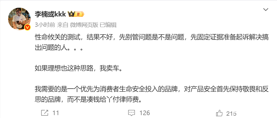 李楠随后继续发文表示,“性命攸关的测试,结果不好,先别管问题是不是问题,先固定证据准备起诉解决搞出问题的人。如果理想也这种思路,我卖车。”