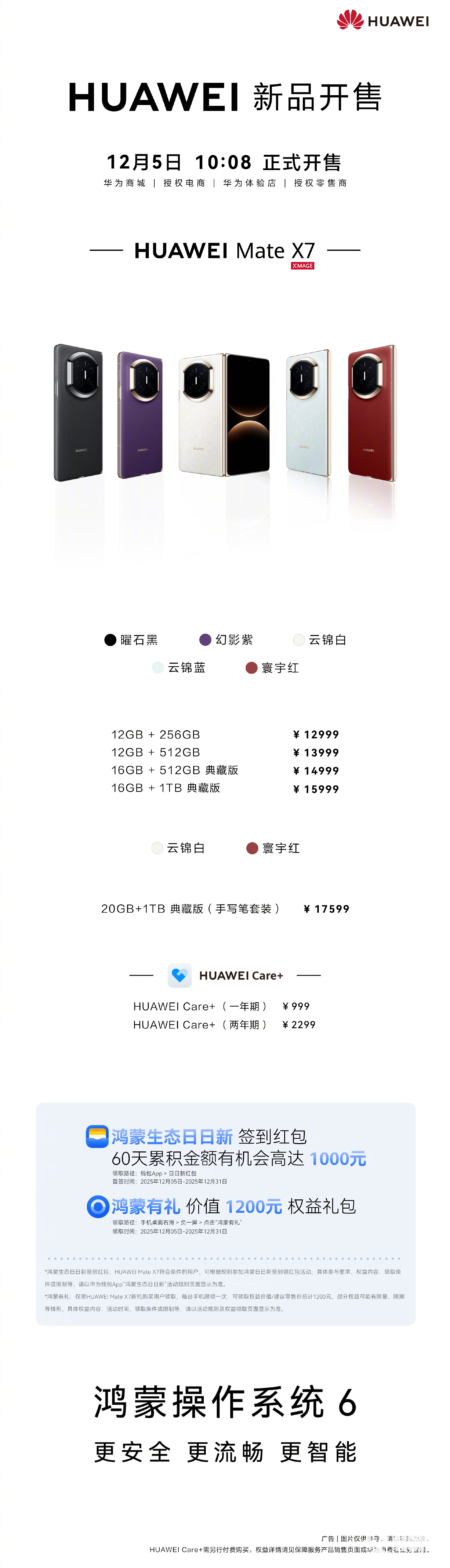 2025年12月5日,华为终端微博官宣,华为Mate X7于今日10点正式开售,售价12999元起。