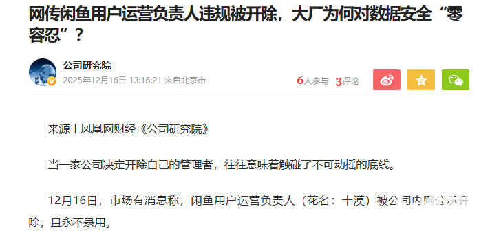 2025年12月16日消息,据凤凰网财经报道,阿里巴巴旗下二手交易平台,闲鱼用户运营负责人(花名:十漠)因严重违反公司数据安全与保密规定,已被公司内网公示开除,永不录用。