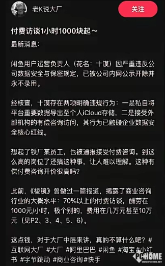 据相关爆料人士,公告内容显示,经核查,闲鱼用户运营负责人十漠,存在两项违规行为:一是,私自将平台重要数据导出至iCloud存储,二是,接受接受外部机构的有偿咨询访问,其行为已触碰企业数据安全核心红线。