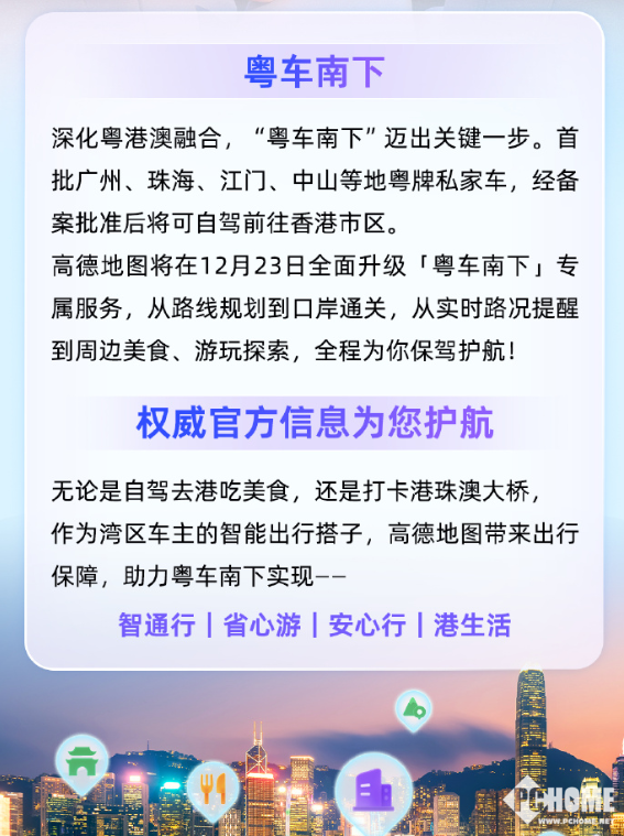据了解,高德地图针对即将实施的"粤车南下"政策,将在12月23日全面升级,从路线规划到口岸通关等,为用户提供便捷安心的旅行服务。广州、珠海、江门、中山等车主绑定射获批的通行证信息可获取直达香港市区的导航路线,该导航覆盖港珠澳大桥+香港主干道,支持复杂路况、变道提醒等功能,并且,导航自动提示入港后禁限行区域、路段,驶出港珠澳大桥接段时,会有语音提醒切换行驶方向。