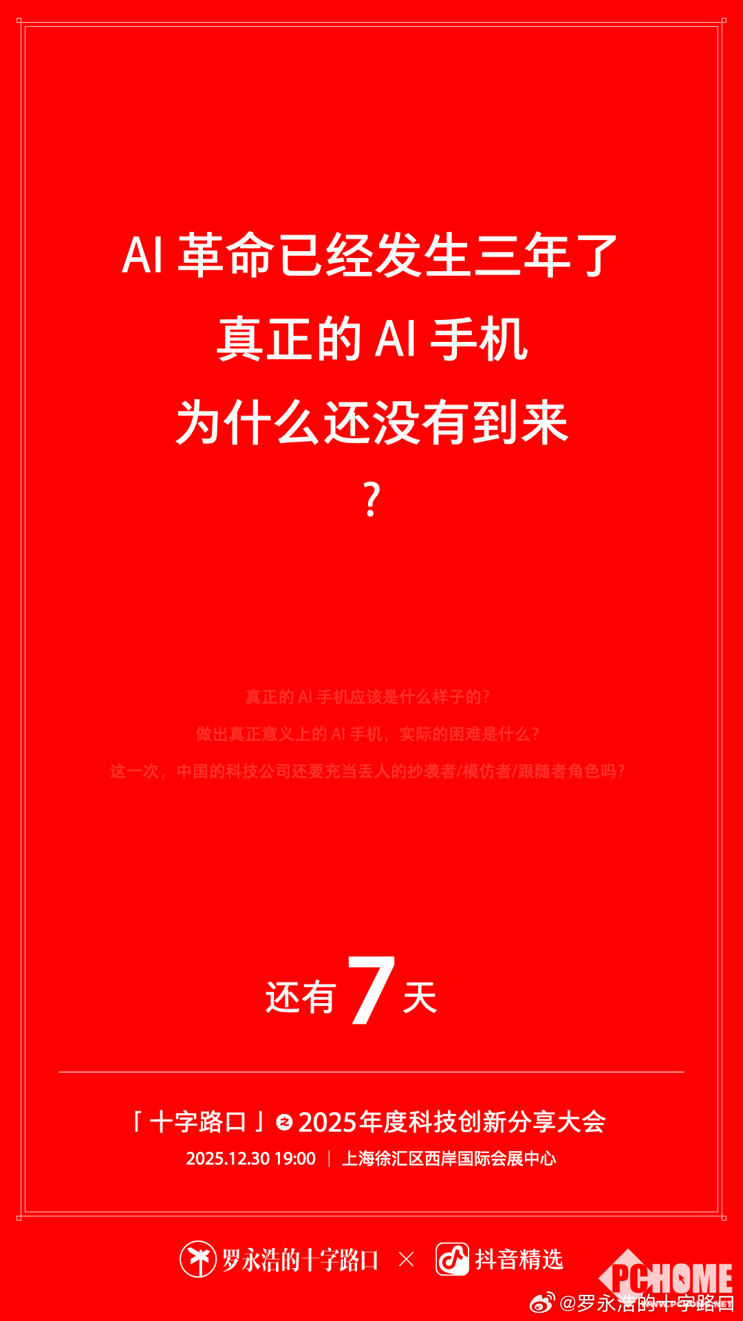 2025年12月23日,罗永浩在社交媒体平台放出了“罗永浩的十字路口”之年度科技创新分享大会(2025)的倒计时海报,预热此次大会。