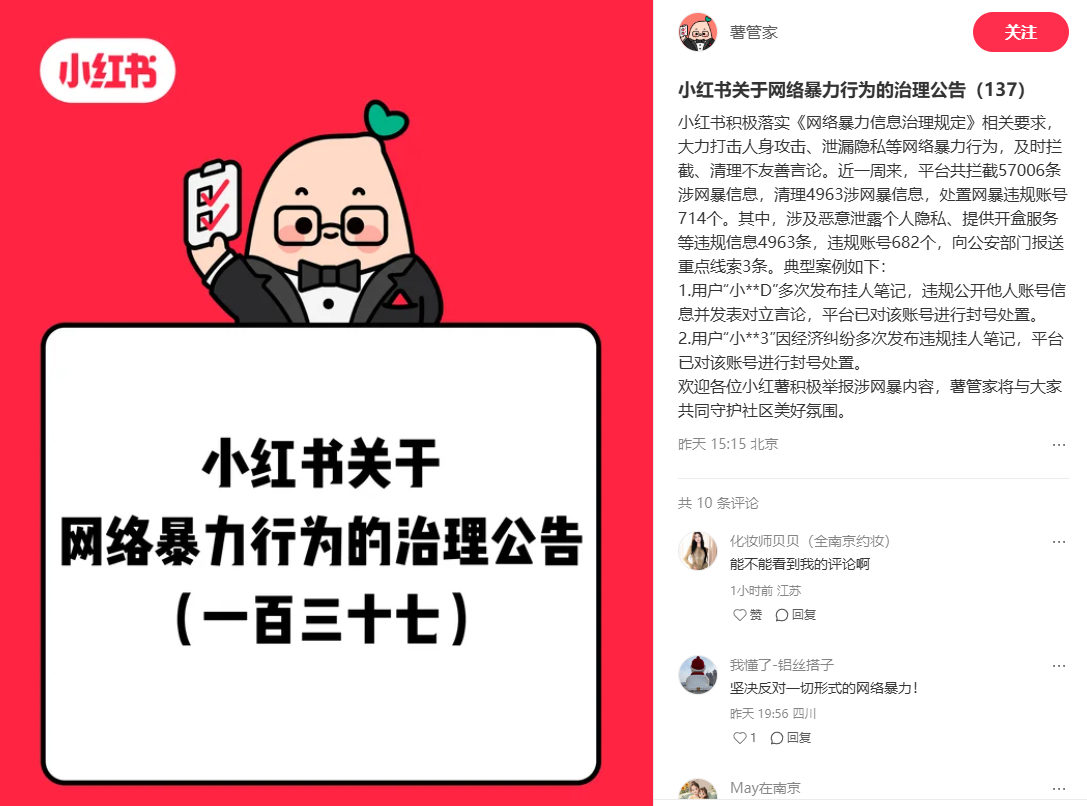 2025年12月23日消息,小红书官方账号薯管家昨日发布关于网络暴力行为的治理公告。