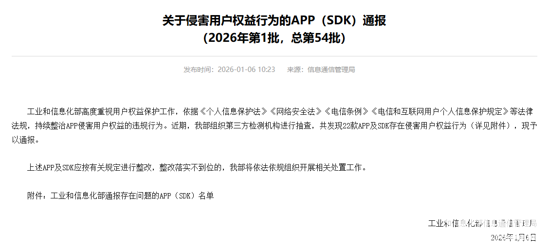2026年1月6日,工信部通报了22款侵害用户权益的App,点名“岁岁”等应用存在强制自动续费问题,要求相关App及SDK应按有关规定进行整改,整改不到位将依法处置。