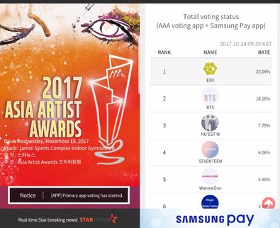 亚洲艺术家大奖(Asia Artist Awards,简称 "AAA")将在三周后举行,“最具人气艺人奖”(Most Popular Artist Award) 的角逐在粉丝中也愈发激烈。