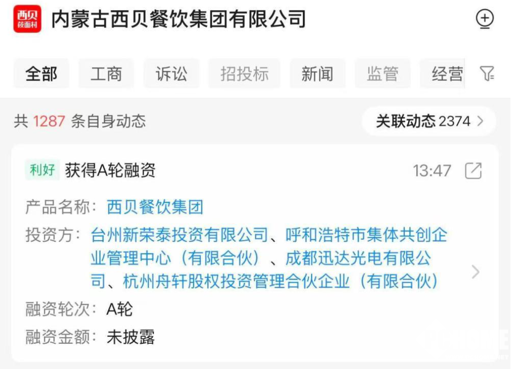 企查查信息显示内蒙古西贝餐饮集团有限公司获A轮融资。投资方有台州新荣泰投资有限公司(由新荣记创始人张勇全资持股)、呼和浩特市集体共创企业管理中心(有限合伙)等,融资金额未对外披露。