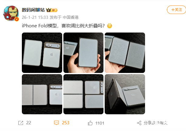 2026年1月21日,数码博主“数码闲聊站”曝光了一组基于目前数据3D打印出的iPhone Fold模型,正式揭露苹果首款折叠屏手机的外观和设计方案。