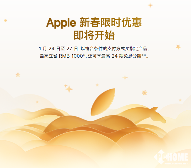 2026年1月22日,苹果中国官网正式上线2026新春限时优惠活动,活动将从1月24日0时01分持续至1月27日23时59分,支持最高24期免息分期。