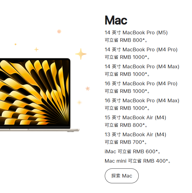 据官网信息,本次促销活动覆盖iPhone、Mac、iPad、Apple Watch及AirPods等全线主力产品多款热门机型,其中MacBook Pro系列优惠力度最大。搭载M4 Pro或M4 Max芯片的14英寸与16英寸MacBook Pro直降1000元,14英寸M5芯片版MacBook Pro立省800元;Mac mini优惠400元,iMac直降600元。