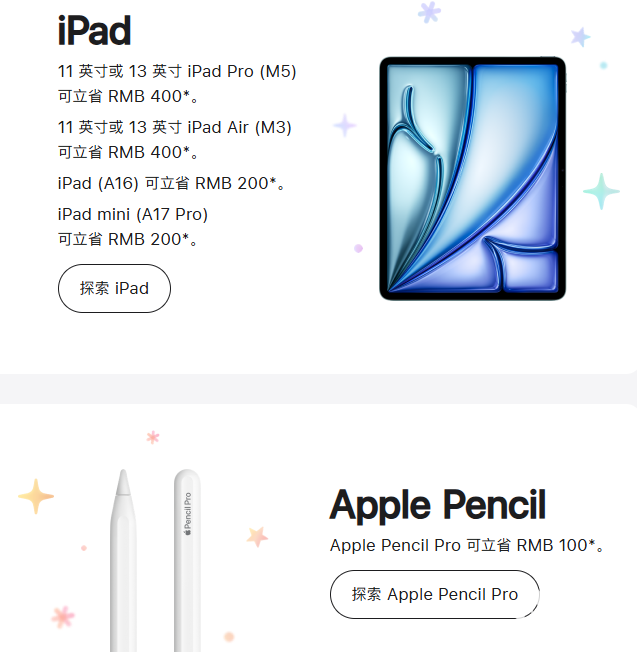 iPad产品中,11英寸及13英寸iPad Pro(M5芯片)、iPad Air(M3芯片)均直降400元,iPad(A16)与iPad mini(A17 Pro)立省200元,Apple Pencil Pro同步优惠100元。