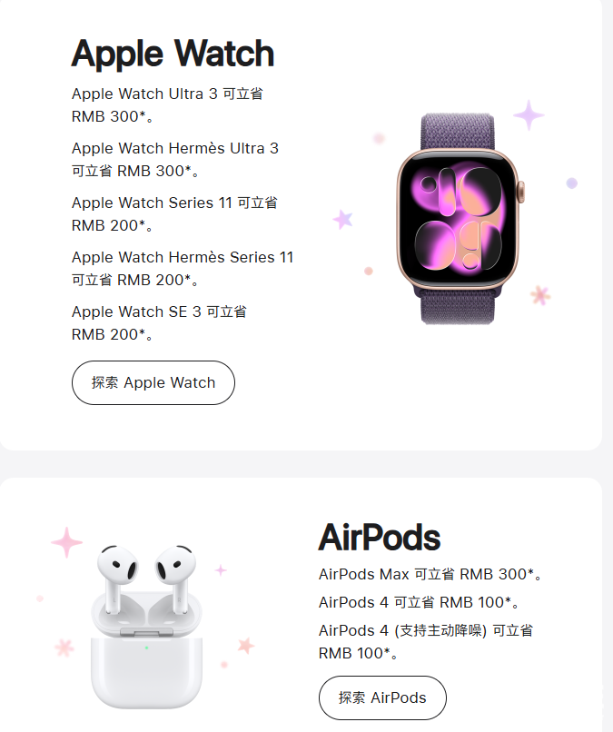 新款AirPods 4及支持主动降噪的AirPods 4版本均直降100元,头戴式旗舰AirPods Max立省300元。