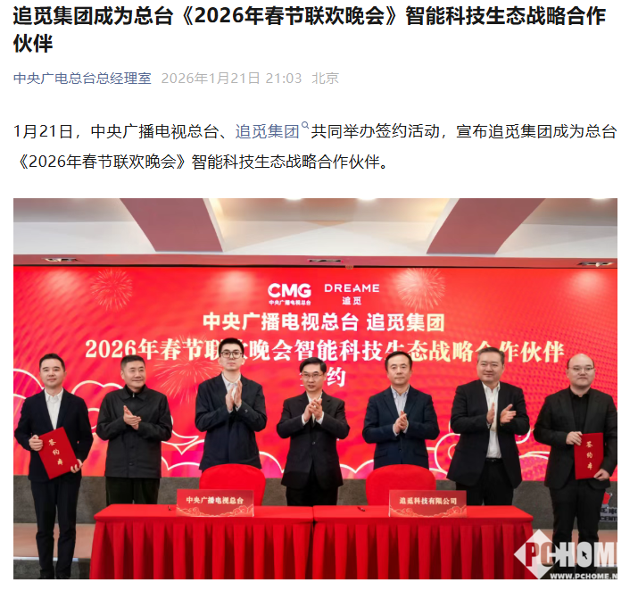 2026年1月22日消息,中央广播电视总台于1月21日正式官宣,追觅集团成为总台《2026年春节联欢晚会》智能科技生态战略合作伙伴。