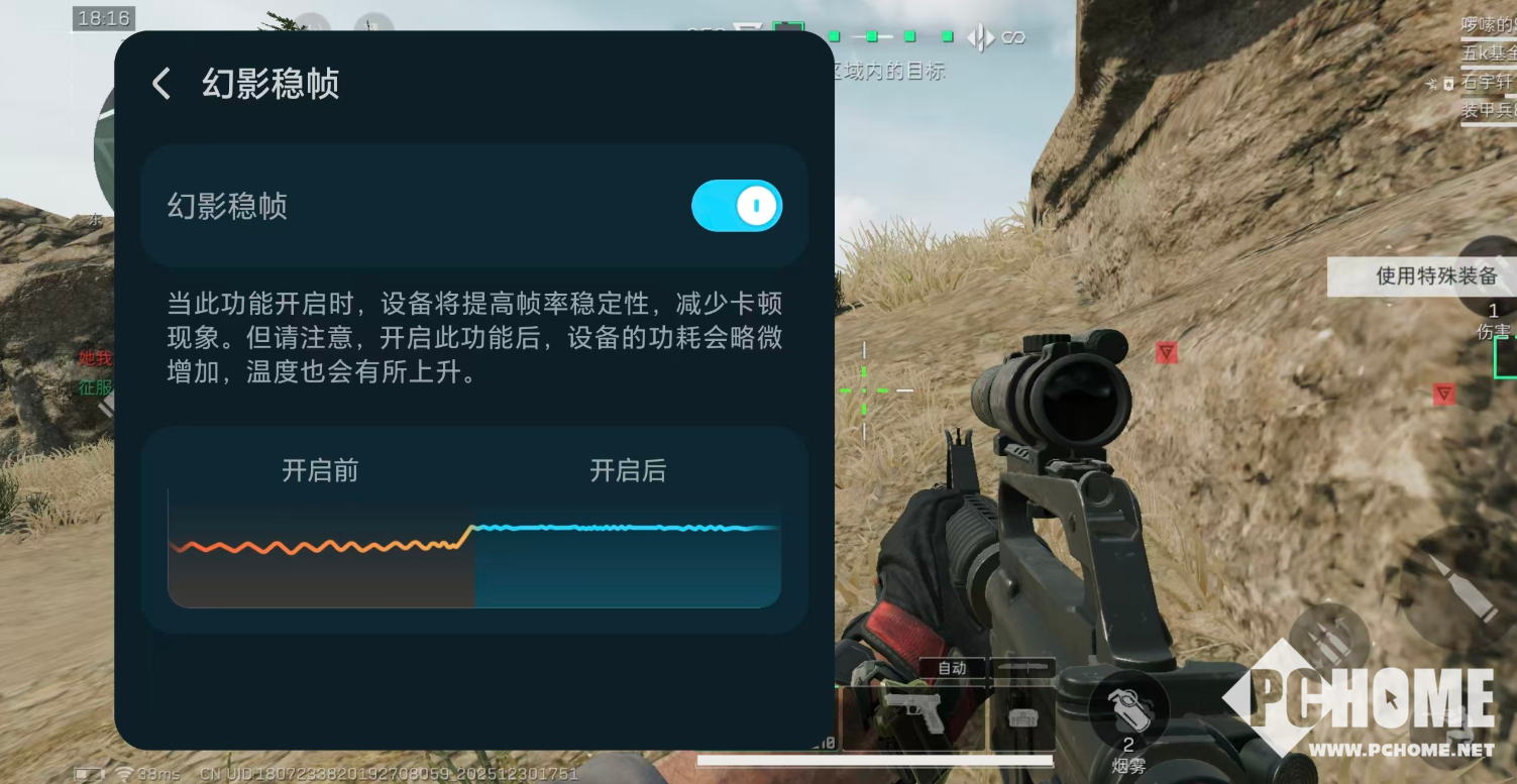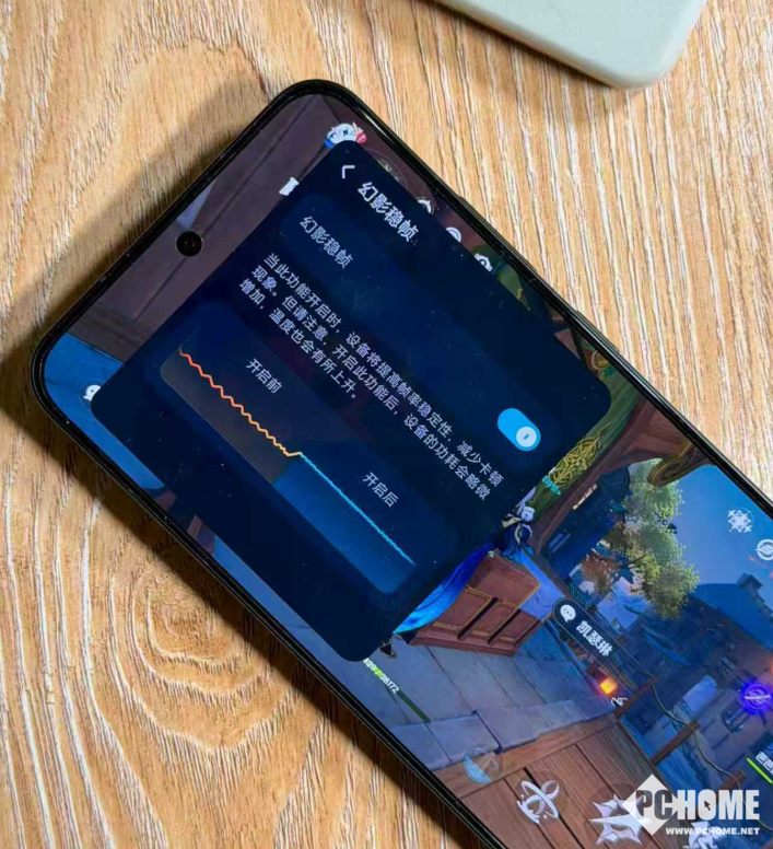 用户可在游戏过程中左滑调出控制中心,一键开启“幻影稳帧”以提升帧率稳定性。