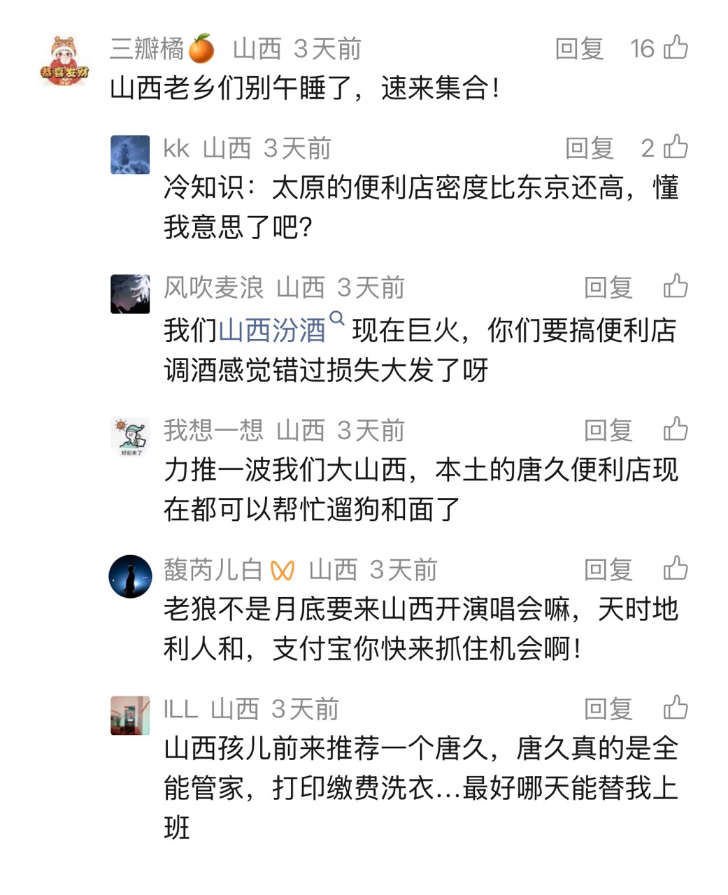 据了解,前不久,支付宝和张兴朝、李嘉诚、鲁豫、佘诗曼、刘震云、小鹿、酷酷的滕、王天放一起在各地办了“便利店文学”大赛。同时,有山西网友在支付宝评论区许愿来唐久便利店,对此官方开展了这次活动,活动地点包括山西省太原市万柏林区新晋祠路华润大厦T4座1楼1006-1007号-唐久便利(华润大厦店)以及山西省太原市万柏林区长兴路1号华润大厦T7幢1层商铺1008号-唐久便利(5183华润大厦T7店)。