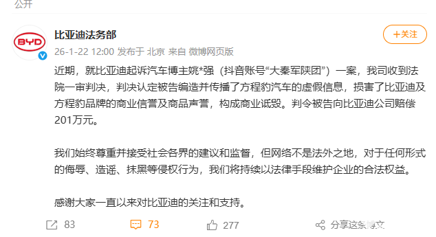 2026年1月22日,比亚迪法务部通过微博发布公告,比亚迪起诉汽车博主姚某强(抖音账号“大秦军陕团”)一案迎来一审判决。法院认定被告编造并传播了方程豹汽车的虚假信息,构成商业诋毁,判令其向比亚迪赔偿经济损失201万元。