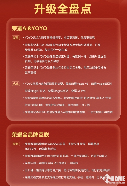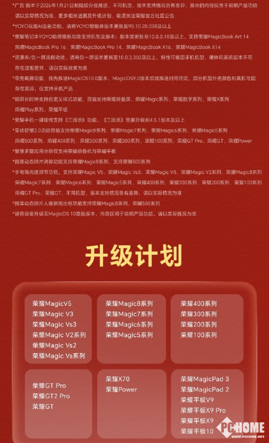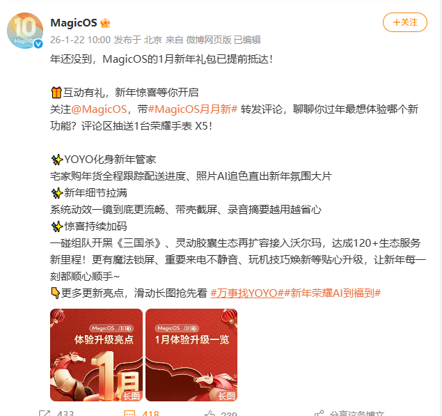 2026年1月22日,荣耀MagicOS官方微博公布了MagicOS系统1月升级内容,包括YOYO建议场景上新、AI追色覆盖更多机型、荣耀笔记本YOYO助理焕新升级、一镜到底动效优化、带壳截屏、手电筒亮度调节、手机平板一碰互传等。