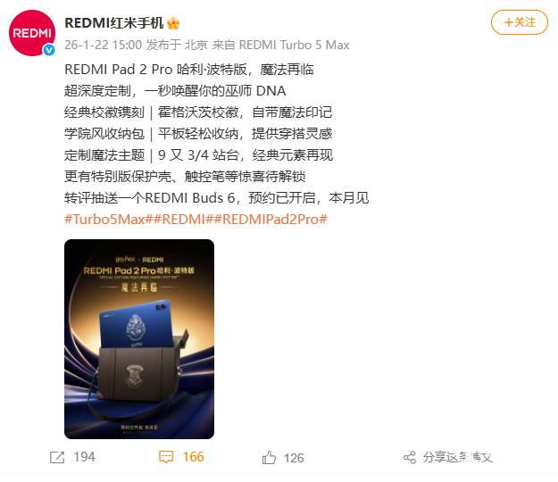 2026年1月22日,小米REDMI官方通过微博官宣,REDMI Pad 2 Pro平板将推出哈利·波特联名版。