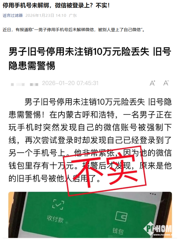 2026年1月23日,微信官方公众号“谣言过滤器”对于“一男子停用手机号后未解绑微信,被别人登上了自己微信”一事进行了辟谣。