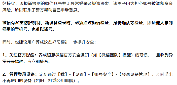 官方介绍,微信有多重防护机制,新设备登录时,必须通过短信验证、身份确认等验证,即使他人拿到停用的手机号,也难以盗号。
