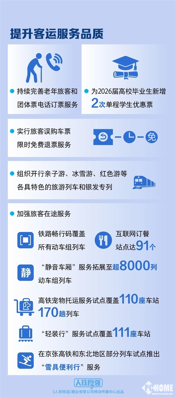 此外,便民服务也在持续升级:“铁路畅行”码覆盖所有动车组,互联网订餐站点达91个;京张高铁及东北地区列车试点“雪具便利行”,;“轻装行”同城行李搬运服务扩展至111座车站。票务服务方面,2026届高校毕业生新增2次单程学生优惠票;误购车票可享限时免费退票;老年旅客与团体票电话订票服务持续完善。