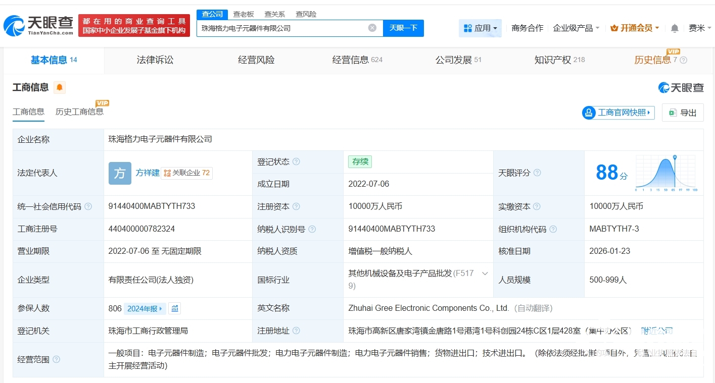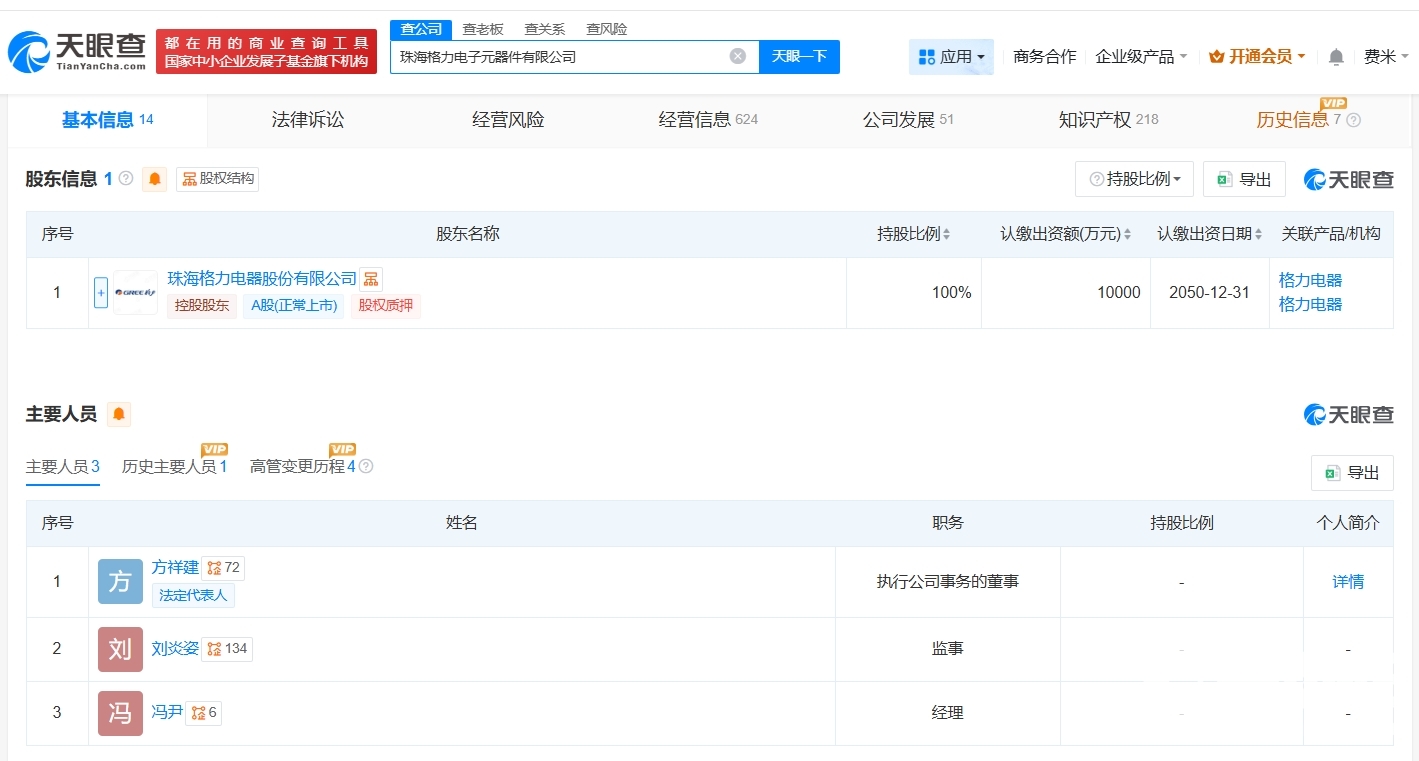 2026年1月26日,天眼查工商信息显示,珠海格力电子元器件有限公司发生重要工商变更,董明珠卸任公司法定代表人、执行董事职务,上述职务由方祥建接任,并同时担任执行公司事务的董事。