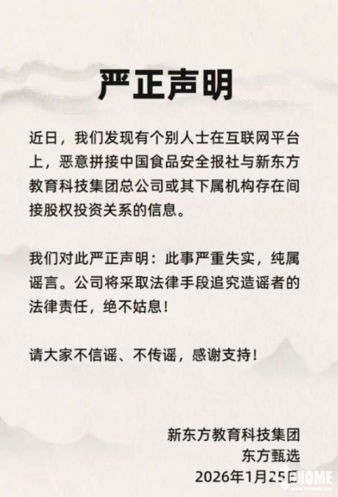 2026年1月26日,新东方教育科技集团创始人俞敏洪通过个人抖音账号发布严正声明,就网传“新东方教育科技集团及其下属机构与中国食品安全报社存在间接股权投资关系” 的信息进行澄清。