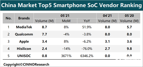 从排名来看,今年5月中国手机处理器市场出货量名次分别为,联发科第一,高通第二,苹果第三,华为海思第四,紫光展锐第五。