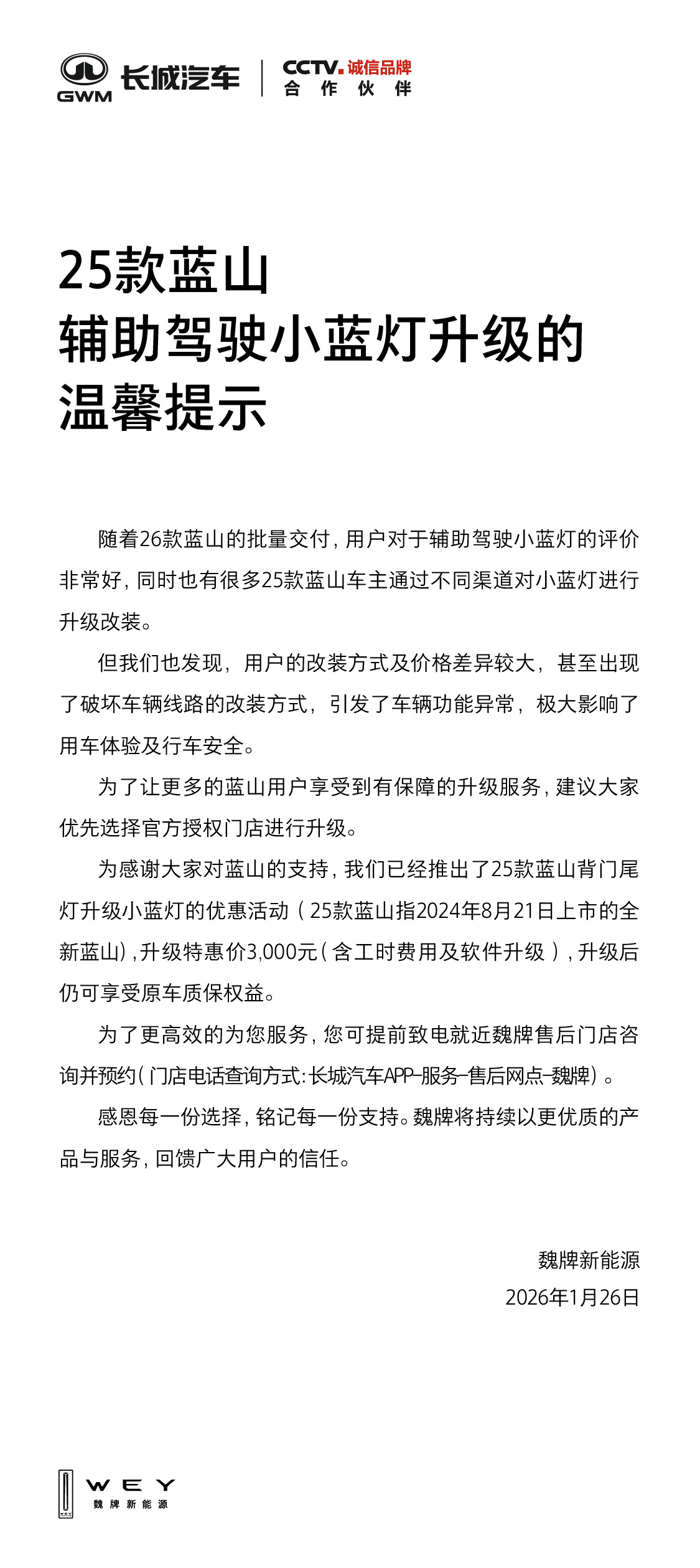 2026年1月26日,魏牌新能源发布25款蓝山辅助驾驶小蓝灯升级温馨提示,针对此前用户自发改装小蓝灯存在的安全隐患,推出官方授权升级服务,特惠价3000元(含工时及软件升级),升级后仍可享受原车质保权益,为车主提供安全、有保障的升级方案。