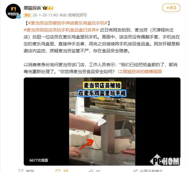 2026年1月26日消息,针对近期“麦当劳天津程林庄店中一店员将手伸进麦乐鸡盒玩手机”一事,涉事门店作出回应,称已对涉事食品包装盒进行集中销毁,并完成门店全面消毒工作。