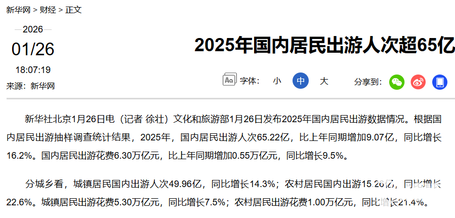 2026年1月27日消息,新华网记者于昨日从文化和旅游部获悉,根据国内居民出游抽样调查统计结果,2025年,国内居民出游人次65.22亿,同比增长16.2%。国内居民出游花费6.30万亿元,同比增长9.5%。