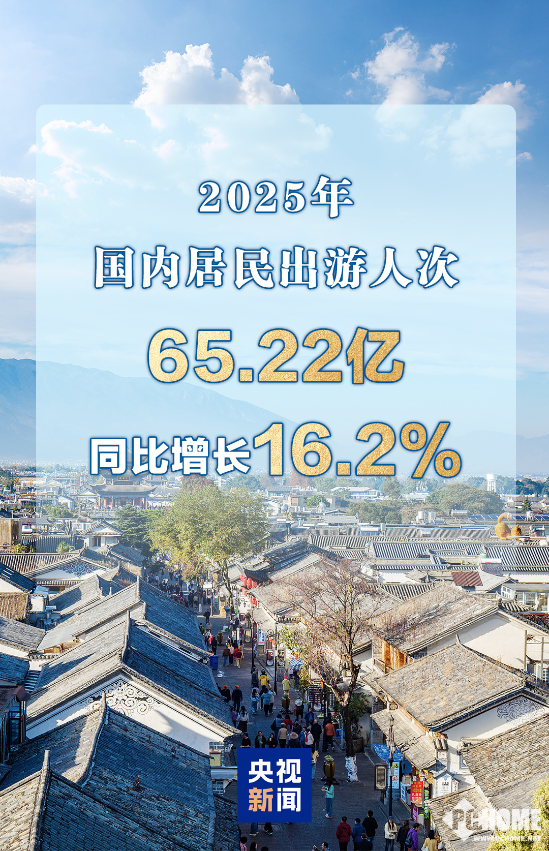 2026年1月27日消息,新华网记者于昨日从文化和旅游部获悉,根据国内居民出游抽样调查统计结果,2025年,国内居民出游人次65.22亿,比上年同期增加9.07亿,同比增长16.2%。国内居民出游花费6.30万亿元,比上年同期增加0.55万亿元,同比增长9.5%。