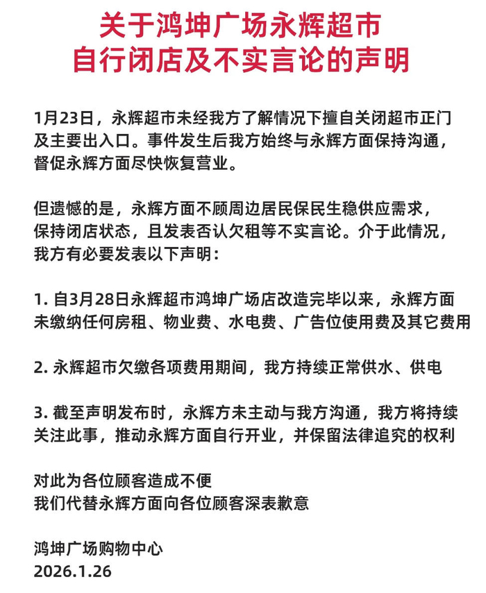 1月26日,鸿坤广场率先发布声明,称永辉在未沟通情况下擅自关闭出入口,且自2025年3月28日门店调改完毕后,始终未缴纳房租、物业费、水电费及广告位使用费等任何费用,且强调欠费期间物业方始终正常供水供电,驳斥停水说法。