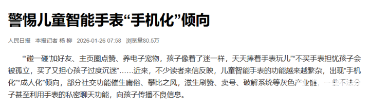 2026年1月27日消息,近年来,部分儿童智能手表逐渐呈现“手机化”“成人化”倾向,偏离安全守护的核心定位,《人民日报》昨日针对此事发文警示,需高度警惕其对未成年人产生的负面影响。