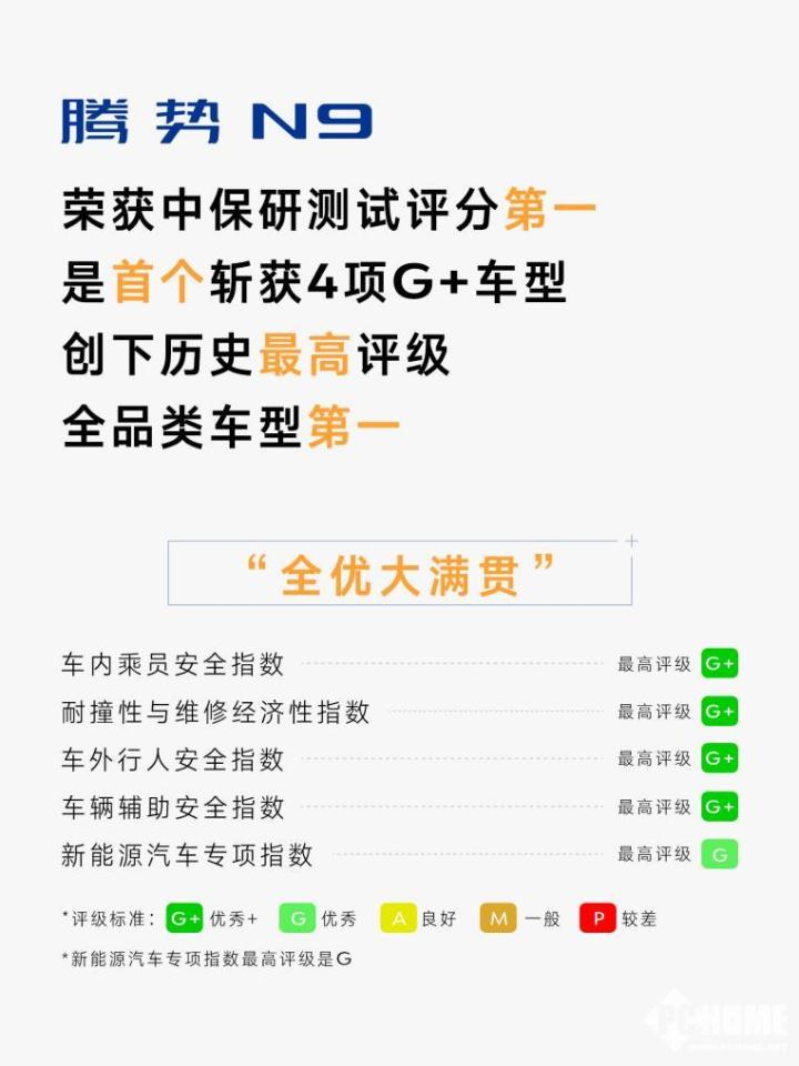 近日,中国保险汽车安全指数(C-IASI)正式发布2025年测评车型第二次结果,腾势N9荣获中保研测试评分第一,是首个斩获4项G+的车型,创下历史最高评级,同时也是中保研全品类车型第一名,在五大维度均获得历史最高评级,用安全守护出行,用实力重新定义安全天花板。