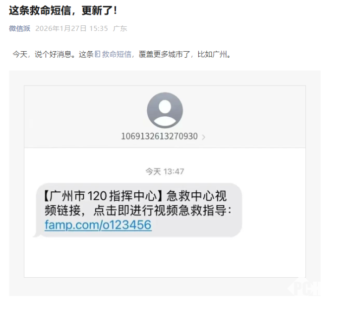 2026年1月27日,微信官方通过“微信派”公众号宣布,救命短信功能已覆盖至广州等更多城市。