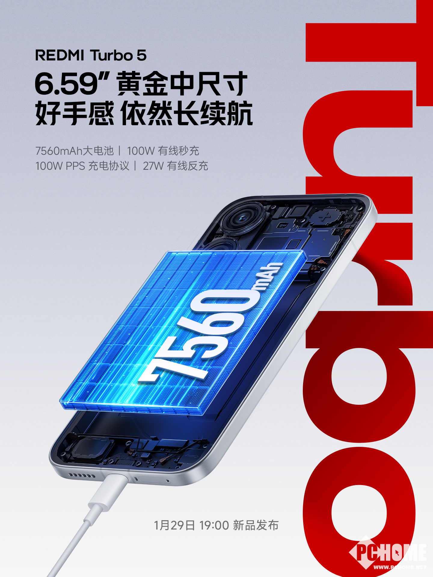 2026年1月28日,REDMI官微发布消息称,REDMI Turbo 5将搭载7560mAh大电池,支持100W有线秒充+27W有线反充,兼容百瓦PPS,快充不挑充电器。