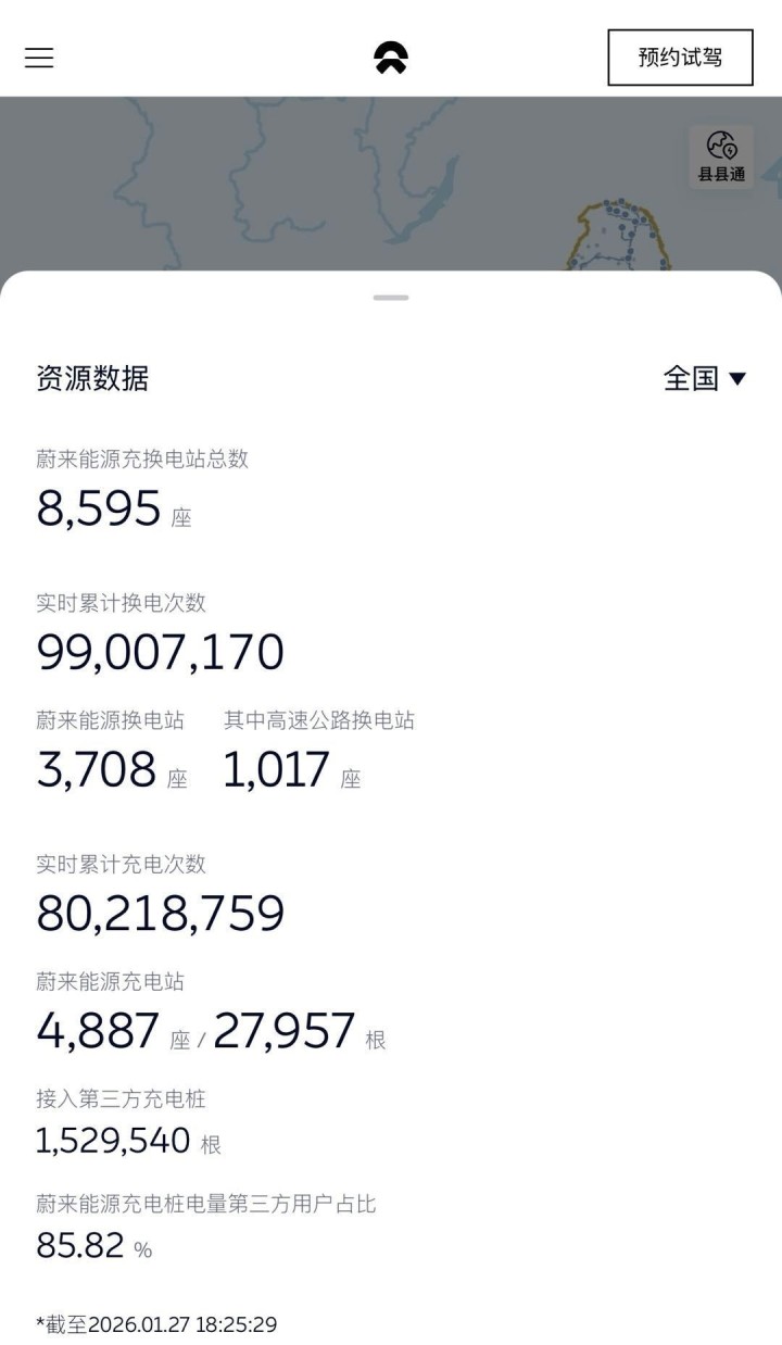 蔚来创始人李斌昨晚微博发布蔚来加电地图数据截图,截至2026年1月27日,蔚来实时累计换电次数已超9900万次,能源充换电站总数达8595座。