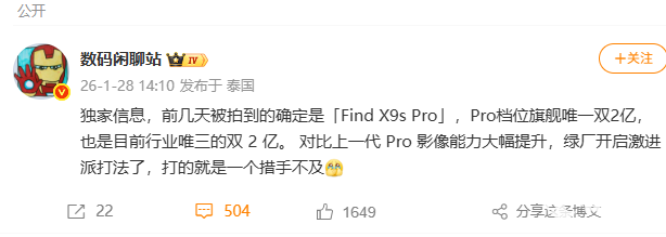 2026年1月28日消息,博主“搞机王腾霄”于昨日发布了一组OPPO Find X9s测试机在户外测试时的抓拍图,机身细节与核心配置同步曝光。且据博主“数码闲聊站”今日爆料,该机的最终命名是OPPO Find X9s Pro。