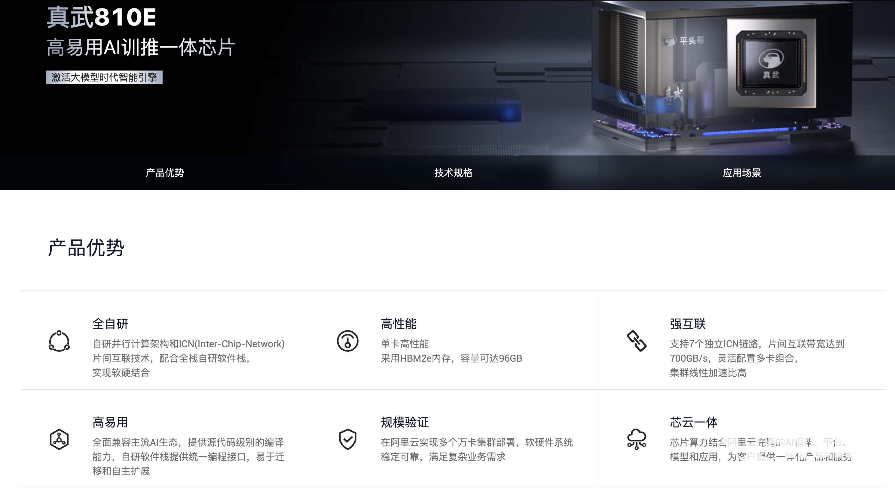 目前,真武810E已在阿里云完成万卡级集群部署验证,系统稳定可靠;同时依托阿里云AI生态实现“芯云一体”,为客户提供从算力到应用的全栈服务,有效解决大模型训练、推理的算力痛点,助力国产AI算力自主可控与产业规模化落地。
