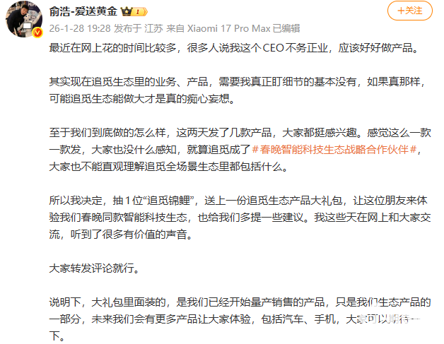 2026年1月29日消息,近日,追觅科技创始人兼CEO俞浩在社交媒体宣布,将抽1位“追觅锦鲤”,并且送上一份追觅生态产品大礼包,涵盖了追觅旗下生活家电、厨电、清洁家电、个护小家电和出行电动车(滑板车)等66款在售量产商品。