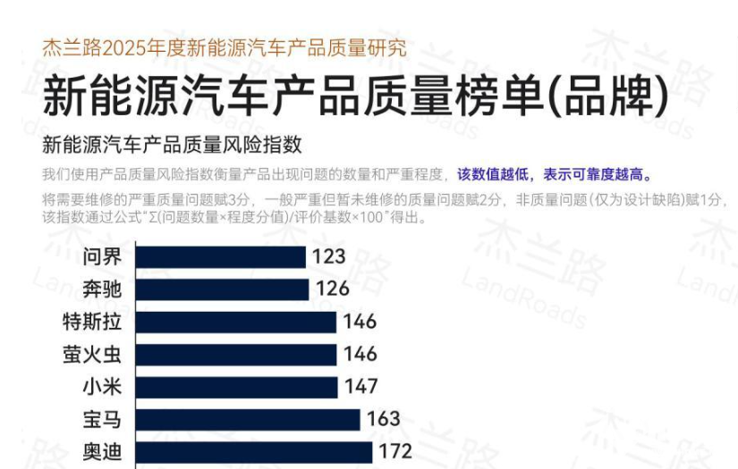 1月29日消息, 汽车分析机构杰兰路发布2025年度新能源汽车品牌质量榜单。榜单显示,问界获2025新能源汽车产品质量品牌榜第一,风险指数123;奔驰以126的成绩数值排名第二;蔚来萤火虫与特斯拉并列第三,风险指数146;小米以一分之差位列第五,风险指数147。