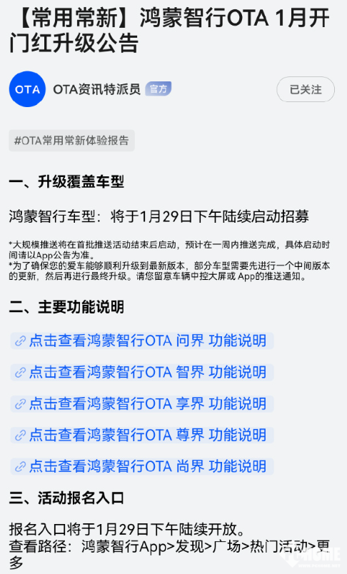 2026年1月29日,鸿蒙智行正式官宣问界系列1月开门红版本OTA升级招募将于今日下午启动。