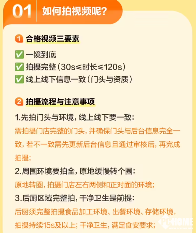 根据平台规则,视频拍摄过程需一镜到底,无中断、无剪辑,时长最少在30秒以内,包括门店门头、资质及后厨环境等;不得使用照片拼接或屏幕录制;后厨拍摄时长不得少于15秒,需完整展示食品加工环境、出餐环境、存储环境。未按规定上传视频或存在视频造假行为的商家,将面临平台结算限制、下线处置等相应处罚。