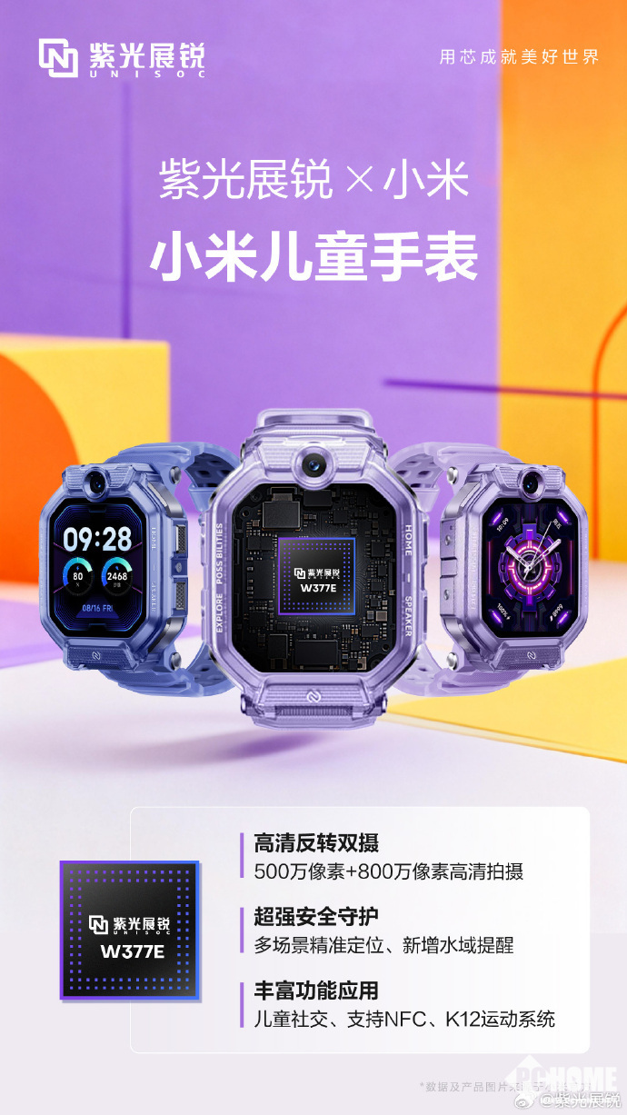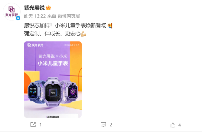 2026年1月29日,紫光展锐通过官方微博正式发文“认领”小米儿童手表,确认该机型核心动力源自展锐W377E高性能智能穿戴芯片。