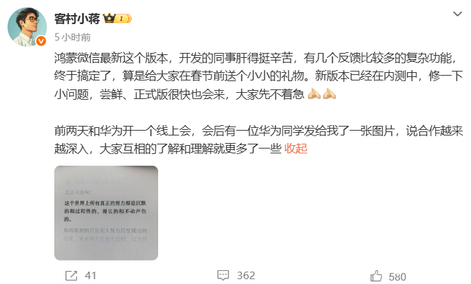 2026年1月29日,微信员工“客村小蒋”在微博发文分享,微信鸿蒙端App新版本已进入内测阶段,开发团队已攻克多个复杂功能,目前正加紧修复细节问题,尝鲜版与正式版将在近期陆续上线。