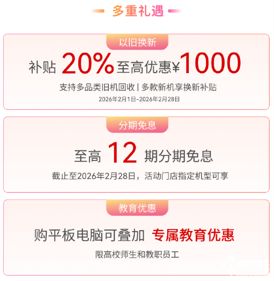 此外,2026年2月1日-28日,推出以旧换新活动,官方补贴20%,至高可优惠1000元。指定机型至高可享12期分期免息。高校师生和教职员工可享平板电脑教育优惠。华为还推出春节限定活动,1月19日-3月3日,进店购机有机会获得新春专属礼品;1月24日-3月3日,可体验华为新年照相馆;1月28日-2月26日进店打卡,最高可抽取Mate XTs大奖。