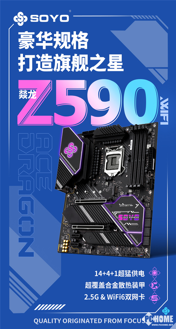 今日,梅捷SY-ACE Z590 WiFi主板正式发布,拥有全新设计的14+4+1相超级供电,搭配60A超低温供电Dr.MOS,能充分的榨取11代酷睿的完整性能。主板整体为暗黑色,标准的ATX版型,供电、M.2区域均覆盖大面积的合金散热装甲,装甲上还有着RGB灯效的点缀。